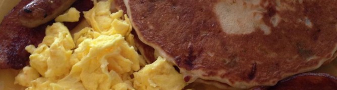 Our Full House with ginger pancakes topped with powdered sugar. Comes with two eggs, two links, and 2 strips of bacon.
