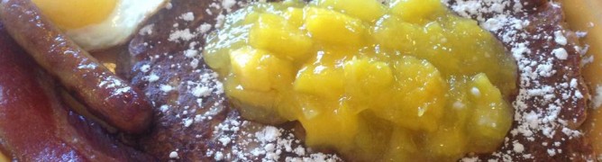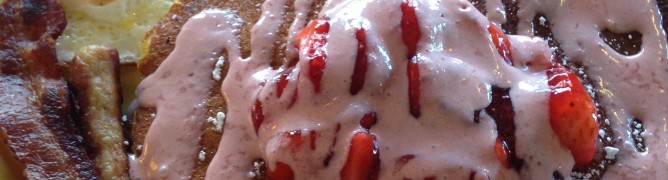 Topped with strawberry compote and strawberry drizzle. Served with 2 eggs, 2 sausage links, and two strips of bacon.
