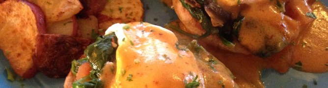 Our Chipotle Eggs Benedict with chipotle hollandaise sauce, mushrooms, spinach, and tomatoes. Served with our famous homers.