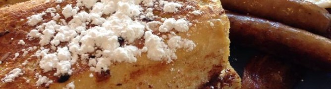 A full house French Toast masterpiece, topped with powdered sugar. Served with 2 eggs, 2 bacon and 2 links.